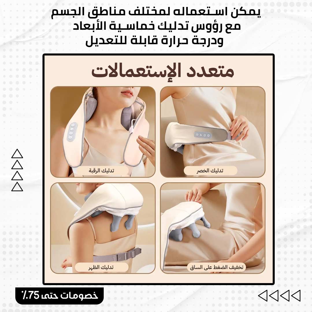 تدليك شامل للجسم: يُستخدم الجهاز لتدليك الكتفين، الرقبة، الساقين، الخصر، والفخذين، مما يجعله جهازًا متعدد الوظائف لتجربة تدليك شاملة.