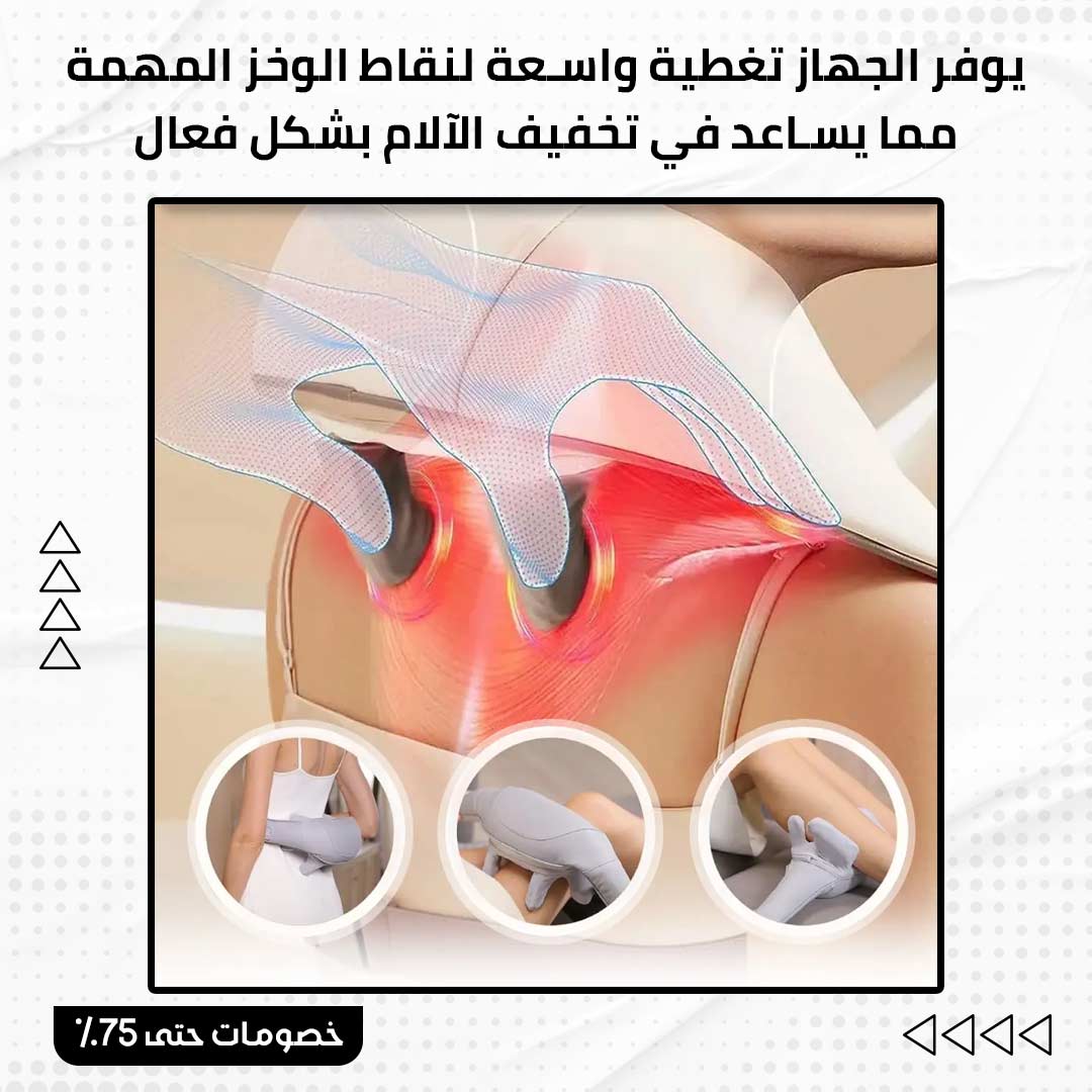 رأس تدليك خماسي الأبعاد: يتميز الجهاز بستة رؤوس تدليك مبتكرة تغطي مساحة كبيرة من الكتف والرقبة، مع إمكانية تعديل درجة الحرارة بين 42-48 درجة مئوية بفضل تقنية التحكم الذكي.